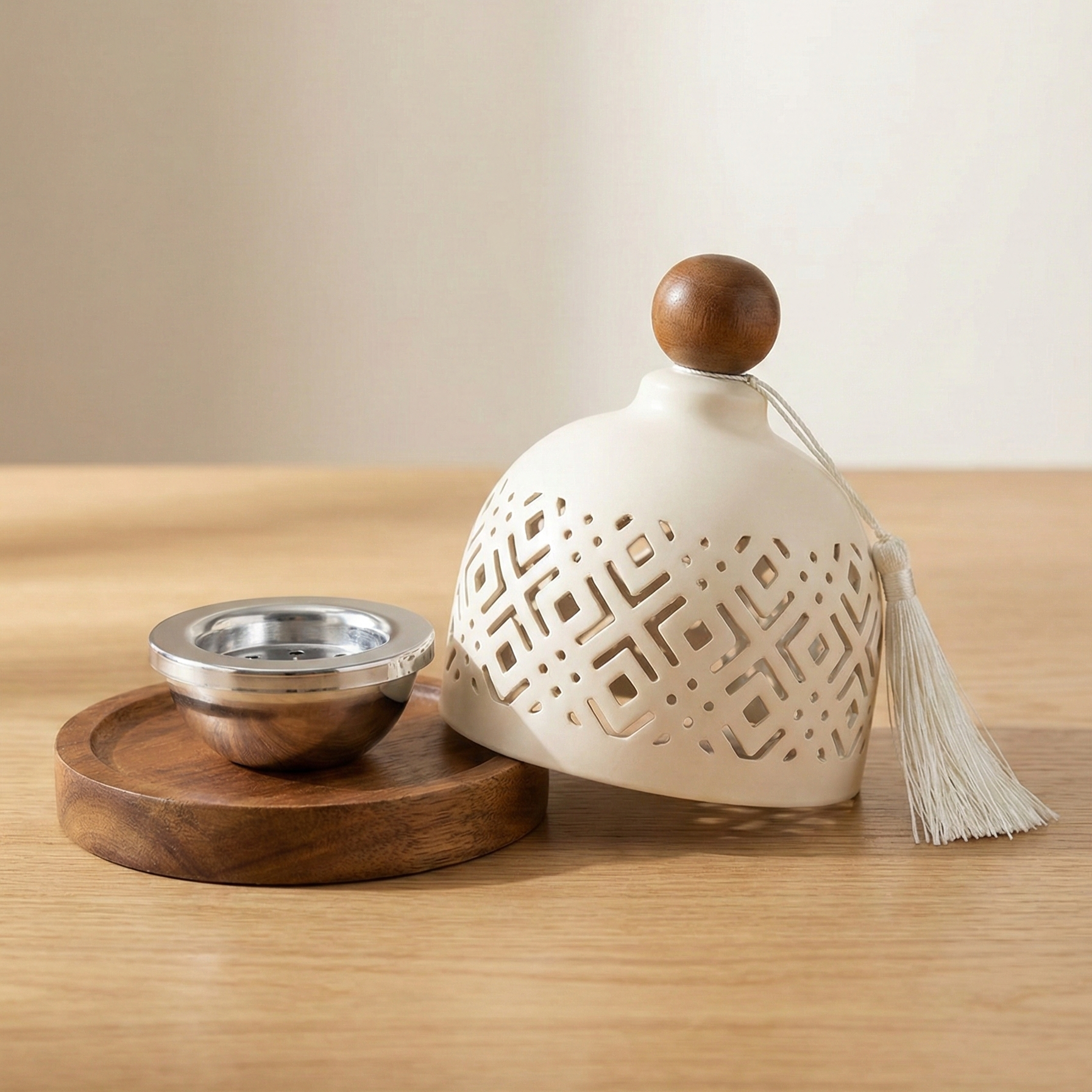 Create a calming Ramadan ambience with the Nur Incense Burner Set. Crafted from ceramic with geometric cut-outs, it gently diffuses bakhoor while doubling as elegant Islamic home decor.