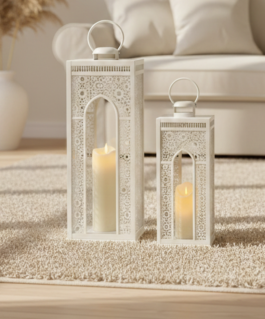 A luxurious pair of lanterns designed with intricate cut-out patterns that create beautiful light reflections. The Amara Lantern Set adds richness and traditional Raya charm to any space.
