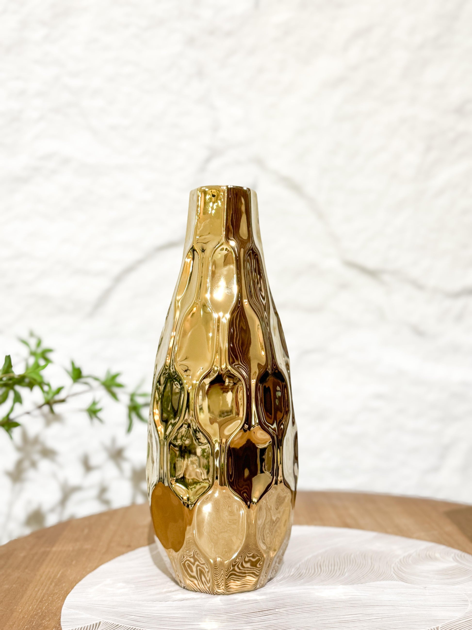 This elegant gold ceramic vase features a hammered texture and a reflective metallic finish, adding a touch of luxury to any space. Its sleek, elongated design makes it perfect for displaying fresh or dried flowers or as a striking standalone decor piece. Ideal for modern, contemporary, or glam interiors, it enhances shelves, tables, or entryways effortlessly.