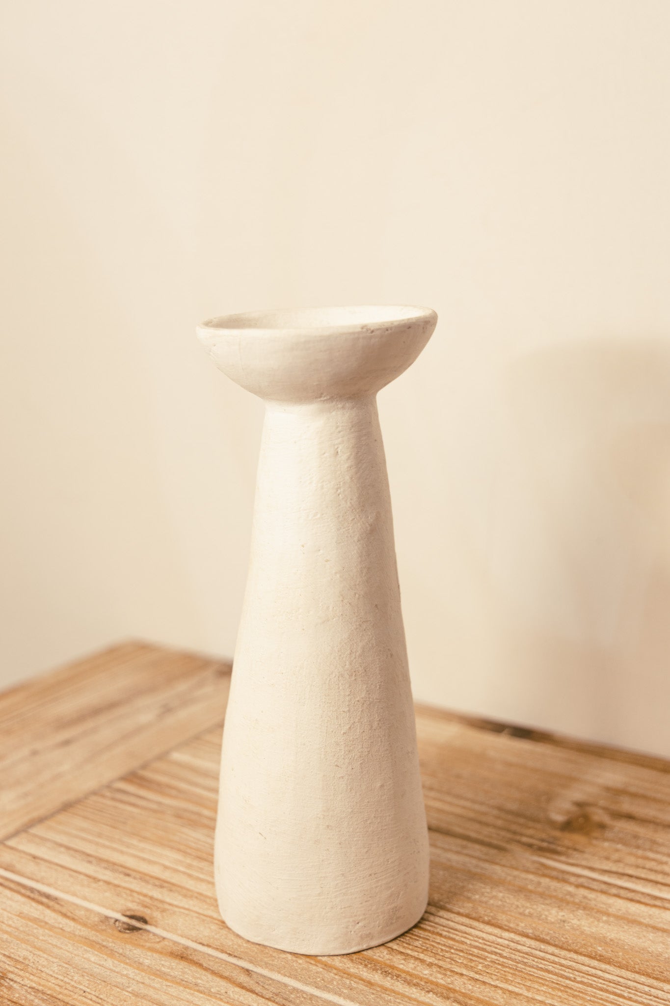 The Serenity Tower Candle Holder is a tall ivory ceramic vase with a broad, welcoming mouth. Its elongated form tapers gently towards the base, exuding a sense of grace and poise. This piece marries simplicity with elegance, perfect for adding a touch of serenity to any room.
